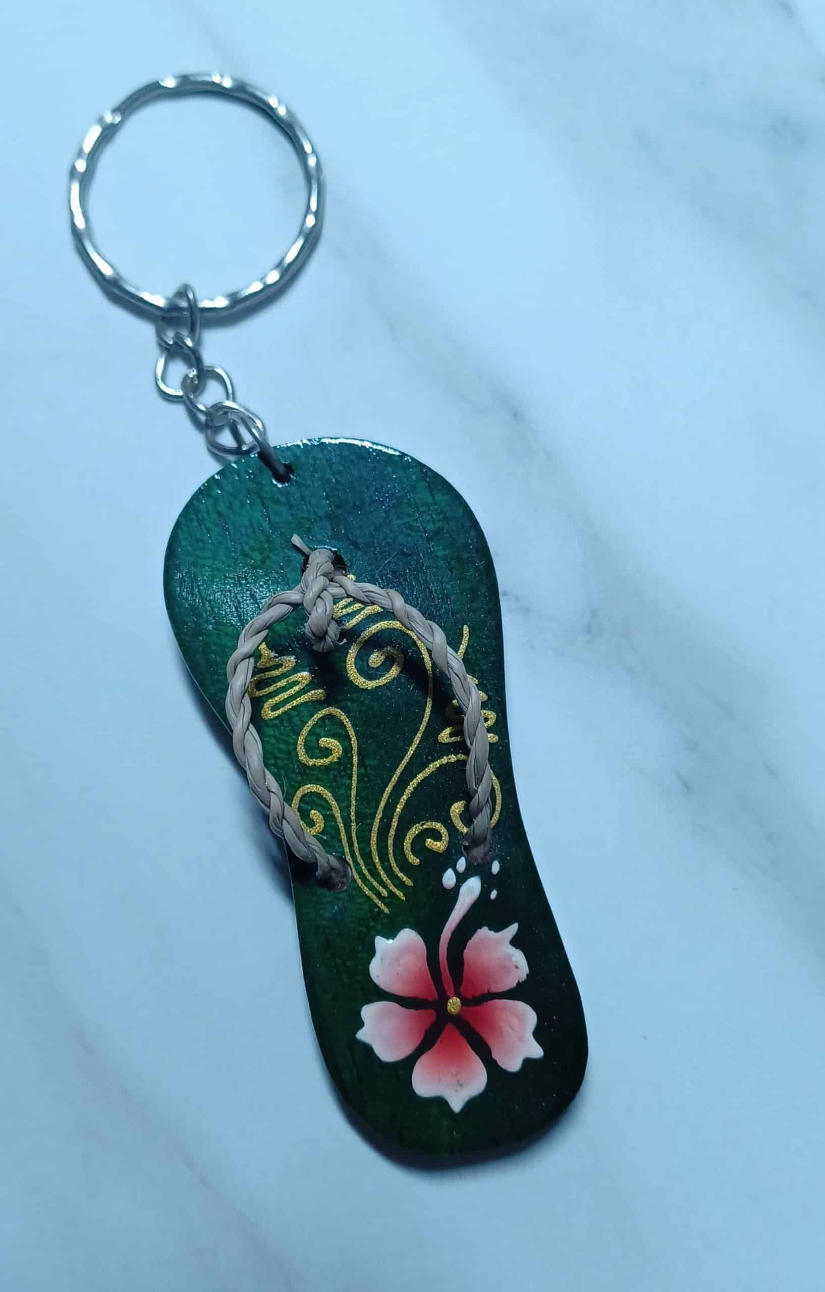 Vintage green wooden flip flop key ring hand crafted in Bali Indonesia